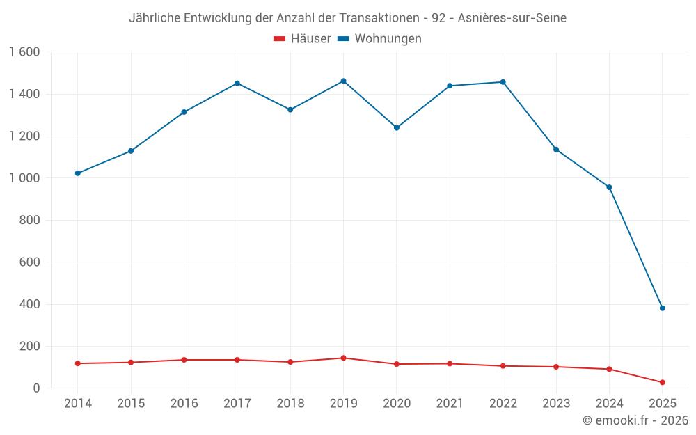 Der Durchschnittspreis auf den 28 Hausgeschäften der letzten 6 Monate in der Gemeinde Asnières-sur-Seine betrug 7 620 € pro Quadratmeter für einen mittleren Immobilienwert von 890 000 €. Über diesen Zeitraum hinweg lagen 60% der Transaktionen zwischen 6 330 und 9 130 € pro Quadratmeter (vom 2. bis zum 8. Dezil).
