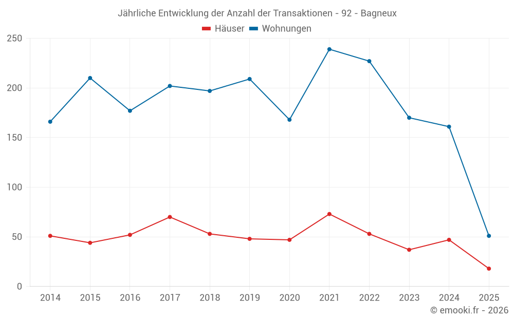 Der Durchschnittspreis auf den 51 Wohnungstransaktionen der letzten 6 Monate in der Gemeinde Bagneux betrug 4 941 € pro Quadratmeter für einen mittleren Immobilienwert von 220 000 €. Über diesen Zeitraum hinweg lagen 60% der Transaktionen zwischen 3 944 und 5 888 € pro Quadratmeter (vom 2. bis zum 8. Dezil).