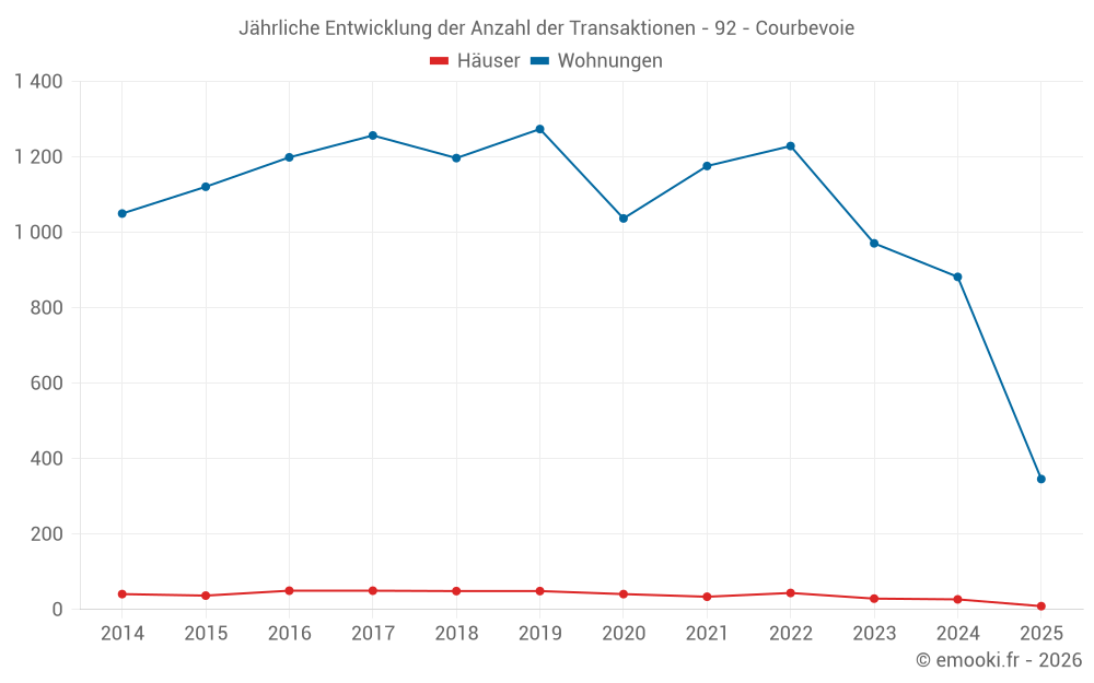 Der Durchschnittspreis auf den 26 Hausgeschäften der letzten 12 Monate in der Gemeinde Courbevoie betrug 9 231 € pro Quadratmeter für einen mittleren Immobilienwert von 884 450 €. Über diesen Zeitraum hinweg lagen 60% der Transaktionen zwischen 6 284 und 12 268 € pro Quadratmeter (vom 2. bis zum 8. Dezil).