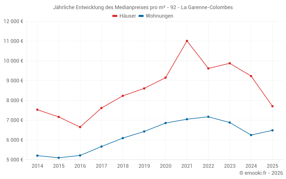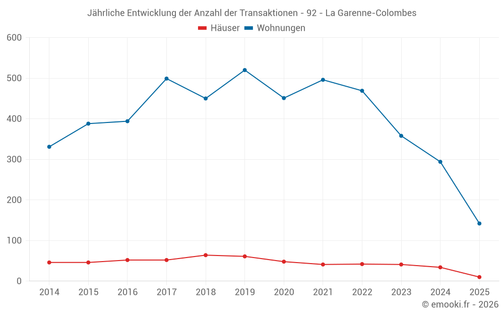 Der Durchschnittspreis auf den 30 Hausgeschäften der letzten 12 Monate in der Gemeinde La Garenne-Colombes betrug 8 920 € pro Quadratmeter für einen mittleren Immobilienwert von 881 950 €. Über diesen Zeitraum hinweg lagen 60% der Transaktionen zwischen 7 088 und 10 798 € pro Quadratmeter (vom 2. bis zum 8. Dezil).