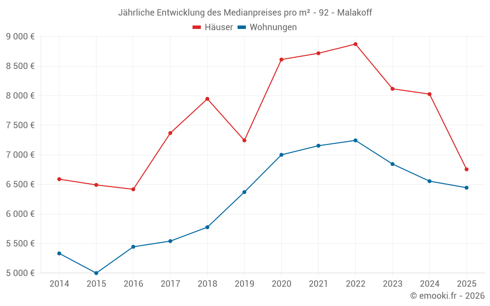 Der Durchschnittspreis auf den 32 Hausgeschäften der letzten 12 Monate in der Gemeinde Malakoff betrug 7 658 € pro Quadratmeter für einen mittleren Immobilienwert von 727 500 €. Über diesen Zeitraum hinweg lagen 60% der Transaktionen zwischen 5 962 und 9 346 € pro Quadratmeter (vom 2. bis zum 8. Dezil).