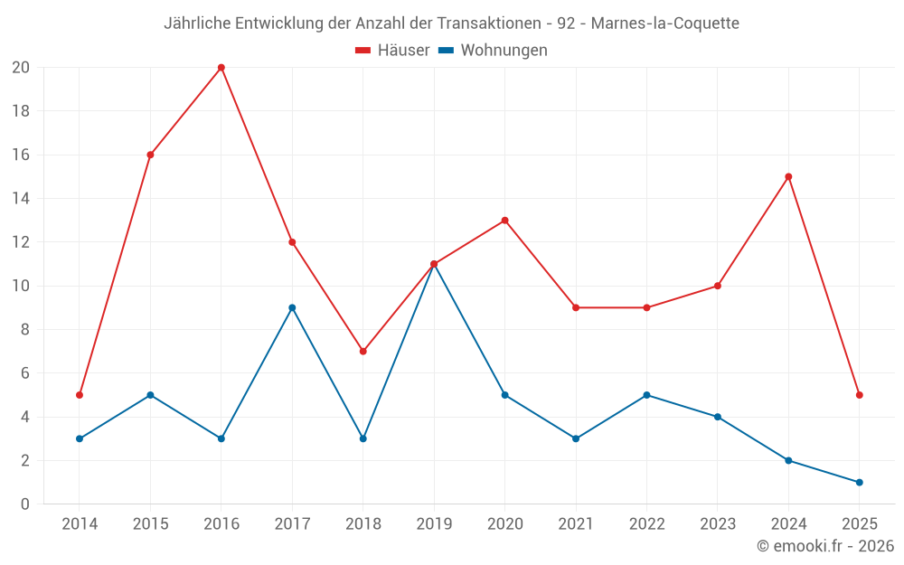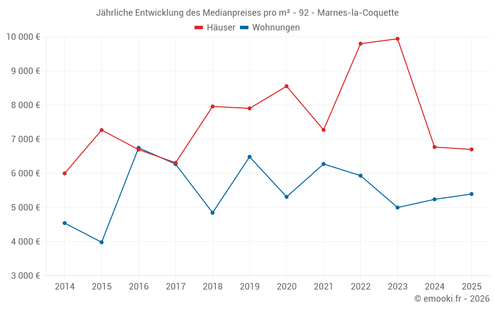Der Durchschnittspreis auf den 28 Hausgeschäften der letzten 24 Monate in der Gemeinde Marnes-la-Coquette betrug 7 598 € pro Quadratmeter für einen mittleren Immobilienwert von 1 168 850 €. Über diesen Zeitraum hinweg lagen 60% der Transaktionen zwischen 6 084 und 10 991 € pro Quadratmeter (vom 2. bis zum 8. Dezil).