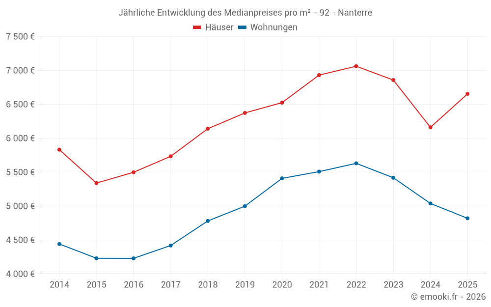 Der Durchschnittspreis auf den 35 Hausgeschäften der letzten 6 Monate in der Gemeinde Nanterre betrug 6 656 € pro Quadratmeter für einen mittleren Immobilienwert von 596 300 €. Über diesen Zeitraum hinweg lagen 60% der Transaktionen zwischen 5 422 und 8 358 € pro Quadratmeter (vom 2. bis zum 8. Dezil).