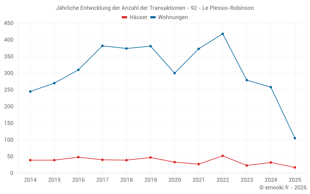 Der Durchschnittspreis auf den 33 Hausgeschäften der letzten 12 Monate in der Gemeinde Le Plessis-Robinson betrug 6 364 € pro Quadratmeter für einen mittleren Immobilienwert von 648 000 €. Über diesen Zeitraum hinweg lagen 60% der Transaktionen zwischen 4 839 und 8 070 € pro Quadratmeter (vom 2. bis zum 8. Dezil).