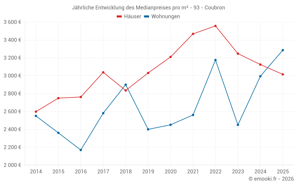 Der Durchschnittspreis auf den 33 Wohnungstransaktionen der letzten 24 Monate in der Gemeinde Coubron betrug 3 047 € pro Quadratmeter für einen mittleren Immobilienwert von 160 000 €. Über diesen Zeitraum hinweg lagen 60% der Transaktionen zwischen 2 379 und 3 406 € pro Quadratmeter (vom 2. bis zum 8. Dezil).