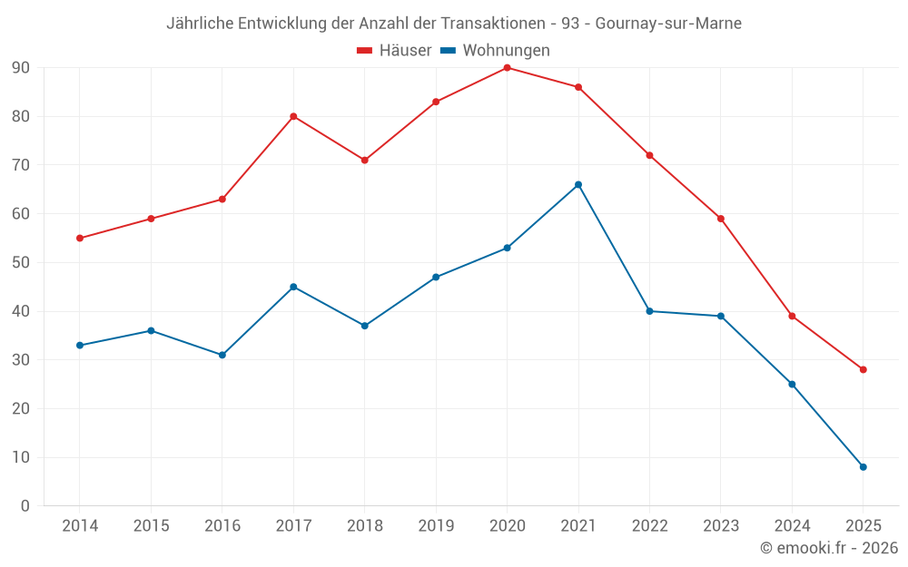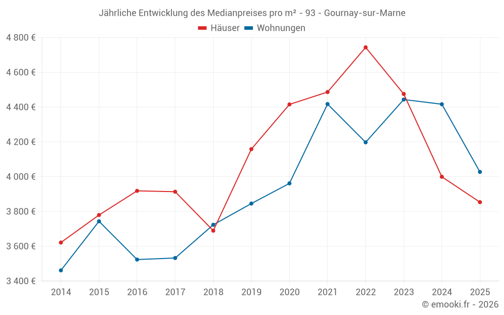 Der Durchschnittspreis auf den 28 Hausgeschäften der letzten 6 Monate in der Gemeinde Gournay-sur-Marne betrug 3 854 € pro Quadratmeter für einen mittleren Immobilienwert von 416 500 €. Über diesen Zeitraum hinweg lagen 60% der Transaktionen zwischen 2 967 und 4 782 € pro Quadratmeter (vom 2. bis zum 8. Dezil).