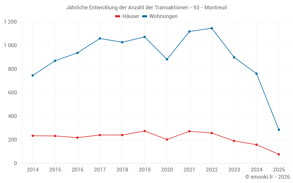 Der Durchschnittspreis auf den 27 Hausgeschäften der letzten 3 Monate in der Gemeinde Montreuil betrug 6 636 € pro Quadratmeter für einen mittleren Immobilienwert von 609 650 €. Über diesen Zeitraum hinweg lagen 60% der Transaktionen zwischen 4 413 und 11 870 € pro Quadratmeter (vom 2. bis zum 8. Dezil).
