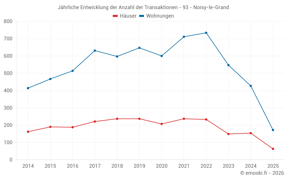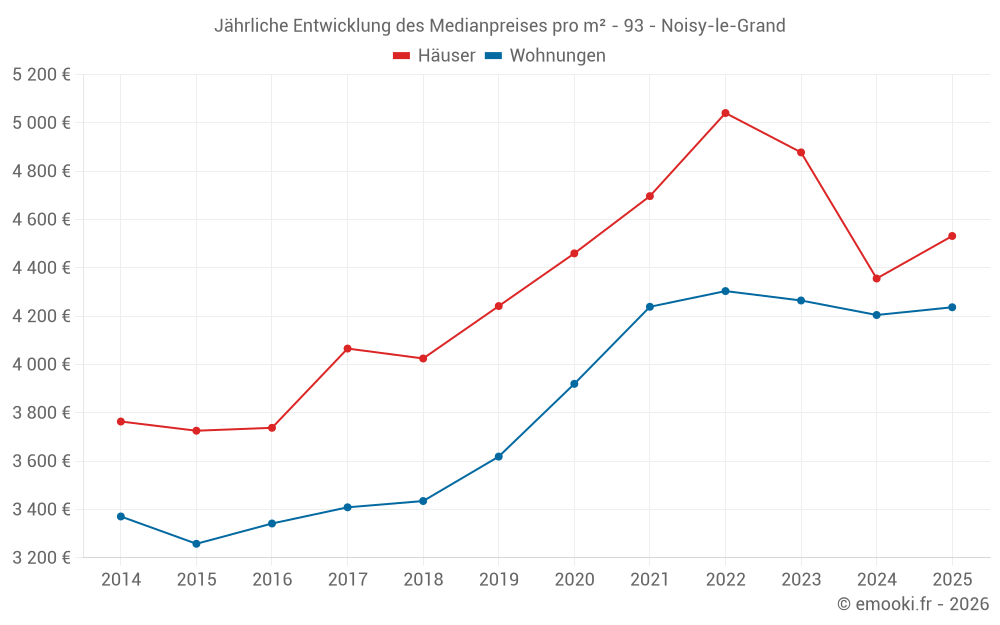 Der Durchschnittspreis auf den 63 Hausgeschäften der letzten 6 Monate in der Gemeinde Noisy-le-Grand betrug 4 532 € pro Quadratmeter für einen mittleren Immobilienwert von 360 000 €. Über diesen Zeitraum hinweg lagen 60% der Transaktionen zwischen 3 422 und 5 687 € pro Quadratmeter (vom 2. bis zum 8. Dezil).