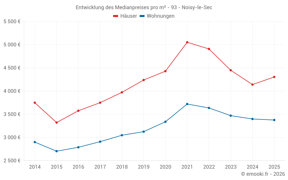 Der Durchschnittspreis auf den 33 Hausgeschäften der letzten 6 Monate in der Gemeinde Noisy-le-Sec betrug 4 304 € pro Quadratmeter für einen mittleren Immobilienwert von 330 000 €. Über diesen Zeitraum hinweg lagen 60% der Transaktionen zwischen 3 004 und 5 654 € pro Quadratmeter (vom 2. bis zum 8. Dezil).