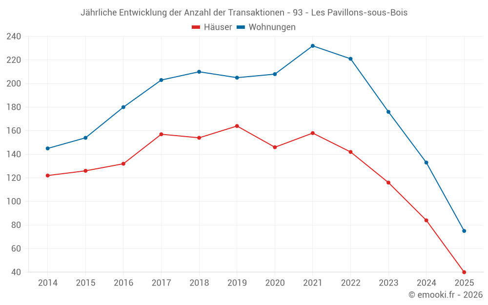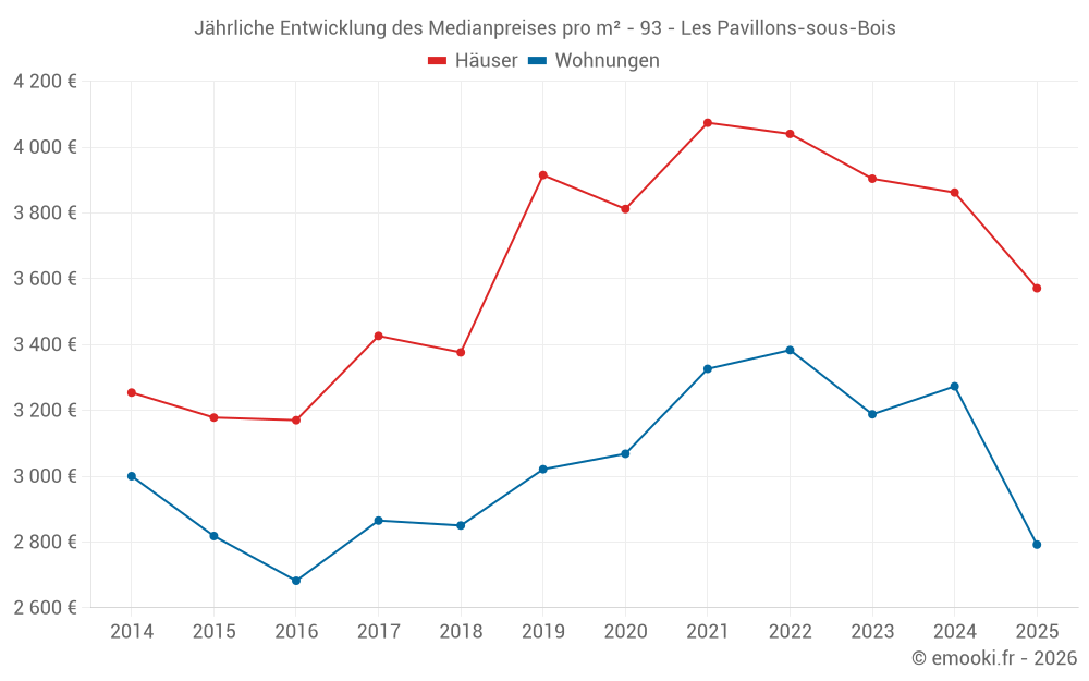 Der Durchschnittspreis auf den 40 Hausgeschäften der letzten 6 Monate in der Gemeinde Les Pavillons-sous-Bois betrug 3 571 € pro Quadratmeter für einen mittleren Immobilienwert von 319 500 €. Über diesen Zeitraum hinweg lagen 60% der Transaktionen zwischen 2 765 und 4 932 € pro Quadratmeter (vom 2. bis zum 8. Dezil).