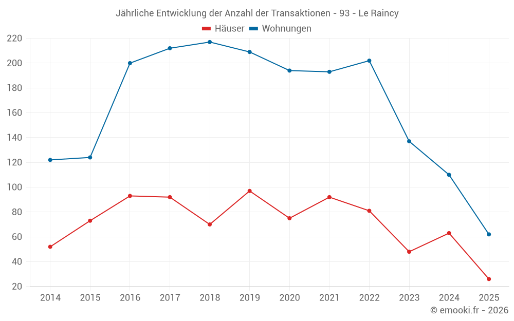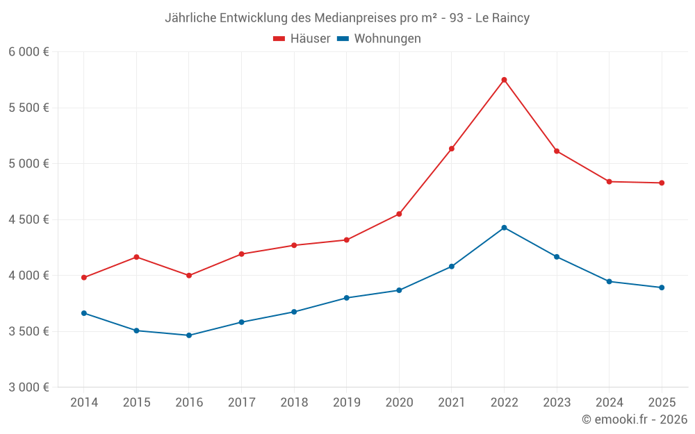Der Durchschnittspreis auf den 26 Hausgeschäften der letzten 6 Monate in der Gemeinde Le Raincy betrug 4 828 € pro Quadratmeter für einen mittleren Immobilienwert von 510 000 €. Über diesen Zeitraum hinweg lagen 60% der Transaktionen zwischen 4 042 und 5 743 € pro Quadratmeter (vom 2. bis zum 8. Dezil).