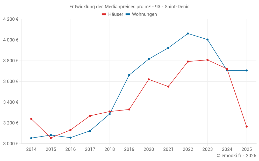Der Durchschnittspreis auf den 94 Wohnungstransaktionen der letzten 3 Monate in der Gemeinde Saint-Denis betrug 3 762 € pro Quadratmeter für einen mittleren Immobilienwert von 159 717 €. Über diesen Zeitraum hinweg lagen 60% der Transaktionen zwischen 2 304 und 4 448 € pro Quadratmeter (vom 2. bis zum 8. Dezil).