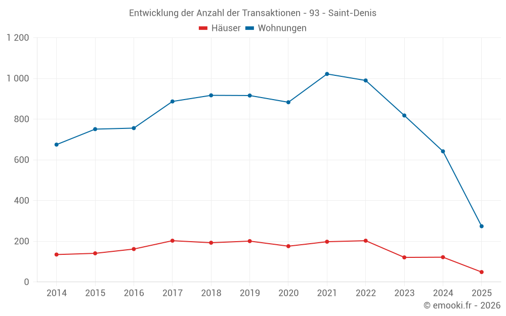 Der Durchschnittspreis auf den 49 Hausgeschäften der letzten 6 Monate in der Gemeinde Saint-Denis betrug 3 165 € pro Quadratmeter für einen mittleren Immobilienwert von 300 000 €. Über diesen Zeitraum hinweg lagen 60% der Transaktionen zwischen 2 744 und 4 316 € pro Quadratmeter (vom 2. bis zum 8. Dezil).