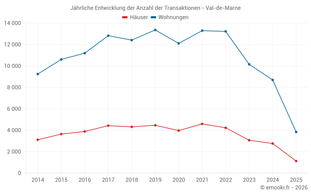 Der Durchschnittspreis auf den 444 Hausgeschäften der letzten 3 Monate im Val-de-Marne-Departement betrug 4 996 € pro Quadratmeter für einen mittleren Immobilienwert von 433 150 €. Über diesen Zeitraum hinweg lagen 60% der Transaktionen zwischen 3 418 und 7 042 € pro Quadratmeter (vom 2. bis zum 8. Dezil).