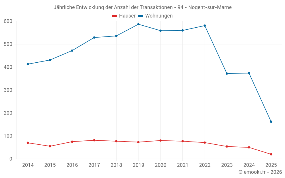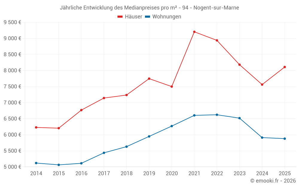 Der Durchschnittspreis auf den 20 Hausgeschäften der letzten 6 Monate in der Gemeinde Nogent-sur-Marne betrug 8 109 € pro Quadratmeter für einen mittleren Immobilienwert von 726 576 €. Über diesen Zeitraum hinweg lagen 60% der Transaktionen zwischen 5 628 und 9 684 € pro Quadratmeter (vom 2. bis zum 8. Dezil).