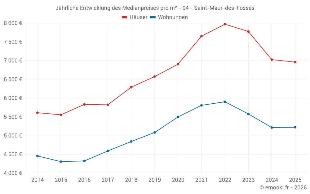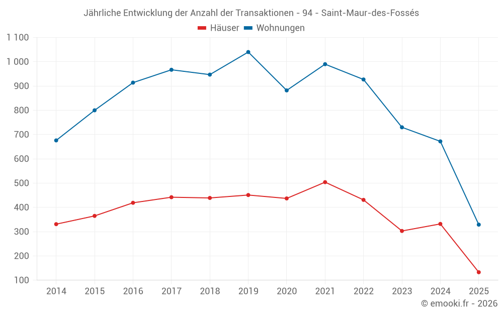 Der Durchschnittspreis auf den 61 Hausgeschäften der letzten 3 Monate in der Gemeinde Saint-Maur-des-Fossés betrug 6 520 € pro Quadratmeter für einen mittleren Immobilienwert von 635 000 €. Über diesen Zeitraum hinweg lagen 60% der Transaktionen zwischen 5 137 und 7 939 € pro Quadratmeter (vom 2. bis zum 8. Dezil).