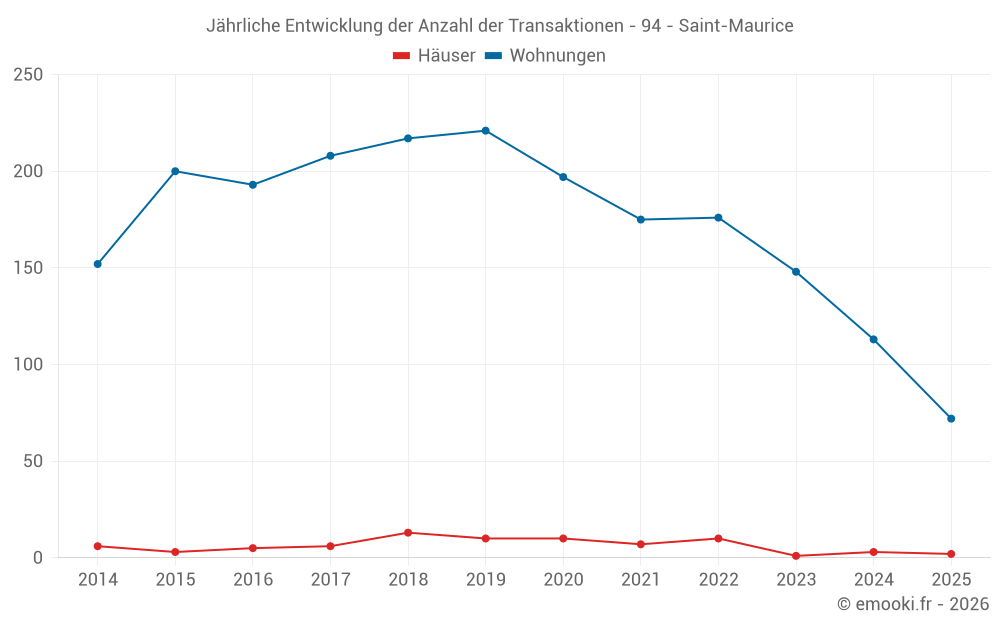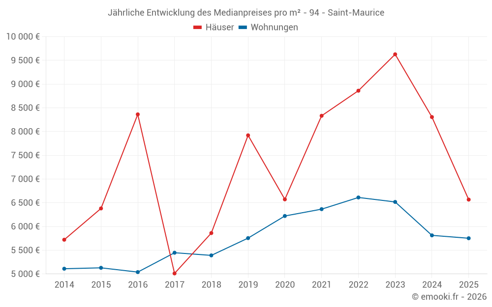 Der Durchschnittspreis auf den 37 Wohnungstransaktionen der letzten 3 Monate in der Gemeinde Saint-Maurice betrug 5 909 € pro Quadratmeter für einen mittleren Immobilienwert von 330 097 €. Über diesen Zeitraum hinweg lagen 60% der Transaktionen zwischen 4 523 und 7 066 € pro Quadratmeter (vom 2. bis zum 8. Dezil).