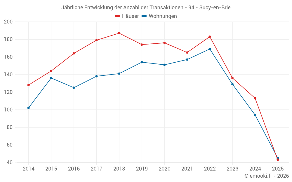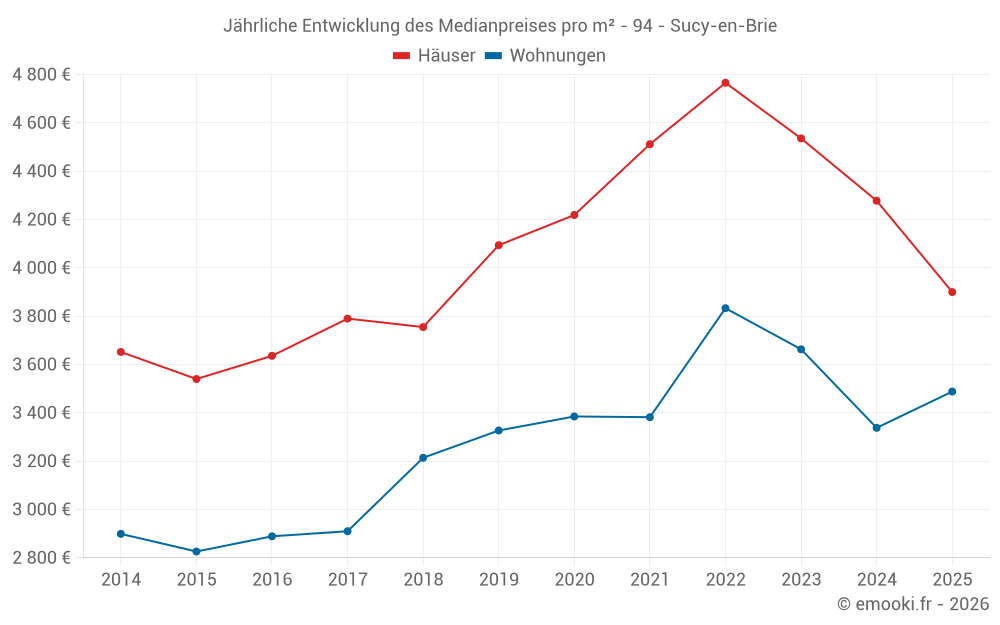 Der Durchschnittspreis auf den 43 Hausgeschäften der letzten 6 Monate in der Gemeinde Sucy-en-Brie betrug 3 900 € pro Quadratmeter für einen mittleren Immobilienwert von 405 000 €. Über diesen Zeitraum hinweg lagen 60% der Transaktionen zwischen 3 072 und 4 540 € pro Quadratmeter (vom 2. bis zum 8. Dezil).