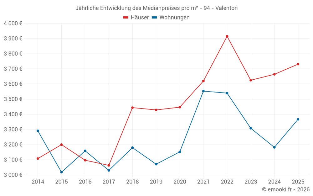 Der Durchschnittspreis auf den 17 Wohnungstransaktionen der letzten 12 Monate in der Gemeinde Valenton betrug 3 182 € pro Quadratmeter für einen mittleren Immobilienwert von 210 000 €. Über diesen Zeitraum hinweg lagen 60% der Transaktionen zwischen 2 800 und 3 730 € pro Quadratmeter (vom 2. bis zum 8. Dezil).
