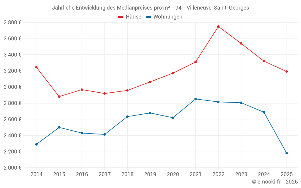 Der Durchschnittspreis auf den 27 Wohnungstransaktionen der letzten 6 Monate in der Gemeinde Villeneuve-Saint-Georges betrug 2 182 € pro Quadratmeter für einen mittleren Immobilienwert von 128 500 €. Über diesen Zeitraum hinweg lagen 60% der Transaktionen zwischen 1 855 und 3 065 € pro Quadratmeter (vom 2. bis zum 8. Dezil).