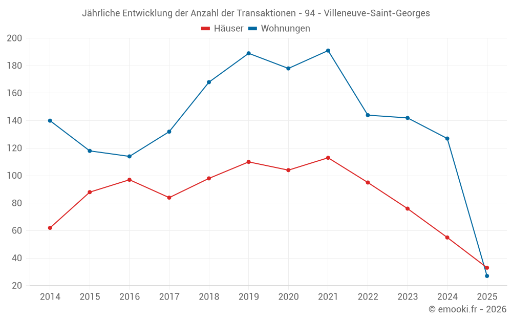 Der Durchschnittspreis auf den 33 Hausgeschäften der letzten 6 Monate in der Gemeinde Villeneuve-Saint-Georges betrug 3 192 € pro Quadratmeter für einen mittleren Immobilienwert von 260 000 €. Über diesen Zeitraum hinweg lagen 60% der Transaktionen zwischen 2 548 und 4 818 € pro Quadratmeter (vom 2. bis zum 8. Dezil).