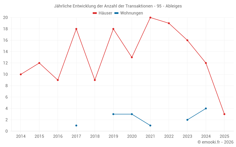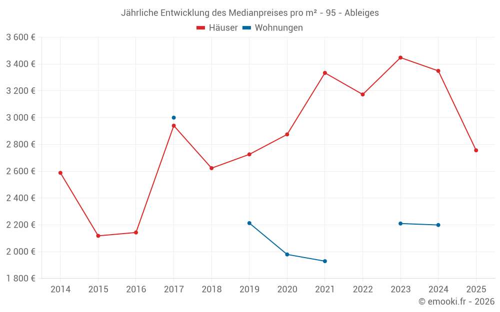 Der Durchschnittspreis auf den 24 Hausgeschäften der letzten 24 Monate in der Gemeinde Ableiges betrug 3 312 € pro Quadratmeter für einen mittleren Immobilienwert von 348 552 €. Über diesen Zeitraum hinweg lagen 60% der Transaktionen zwischen 2 444 und 4 008 € pro Quadratmeter (vom 2. bis zum 8. Dezil).