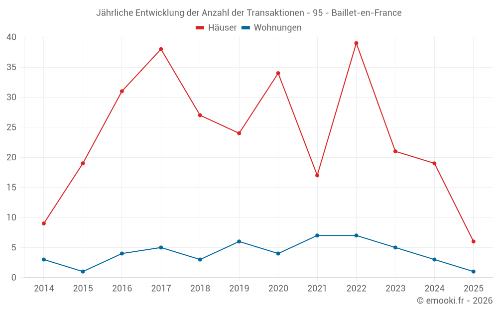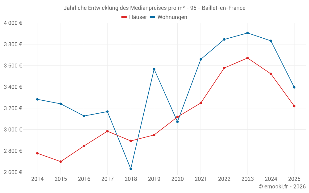 Der Durchschnittspreis auf den 17 Hausgeschäften der letzten 12 Monate in der Gemeinde Baillet-en-France betrug 3 376 € pro Quadratmeter für einen mittleren Immobilienwert von 325 150 €. Über diesen Zeitraum hinweg lagen 60% der Transaktionen zwischen 3 140 und 3 713 € pro Quadratmeter (vom 2. bis zum 8. Dezil).