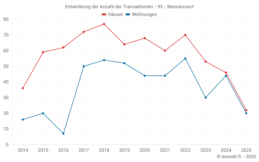 Der Durchschnittspreis auf den 22 Hausgeschäften der letzten 6 Monate in der Gemeinde Bessancourt betrug 3 736 € pro Quadratmeter für einen mittleren Immobilienwert von 335 850 €. Über diesen Zeitraum hinweg lagen 60% der Transaktionen zwischen 2 816 und 5 324 € pro Quadratmeter (vom 2. bis zum 8. Dezil).