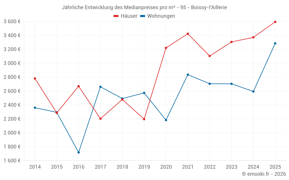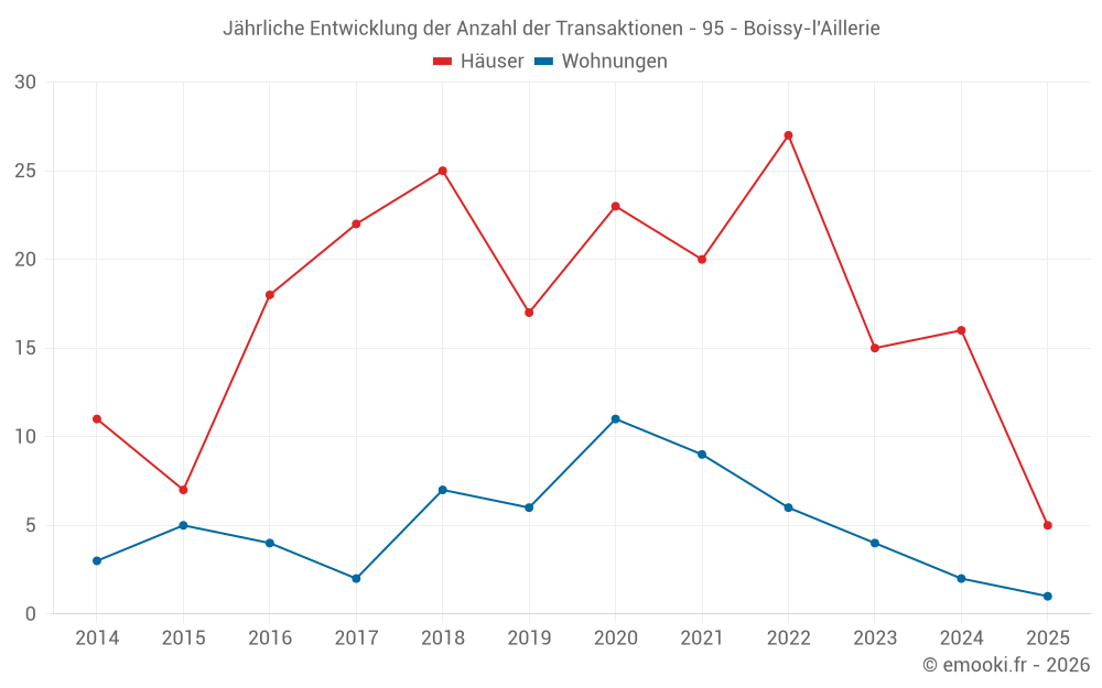 Der Durchschnittspreis auf den 28 Hausgeschäften der letzten 24 Monate in der Gemeinde Boissy-l'Aillerie betrug 3 378 € pro Quadratmeter für einen mittleren Immobilienwert von 367 175 €. Über diesen Zeitraum hinweg lagen 60% der Transaktionen zwischen 2 569 und 3 770 € pro Quadratmeter (vom 2. bis zum 8. Dezil).