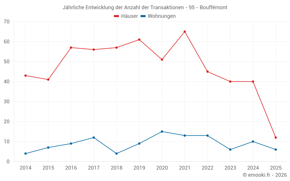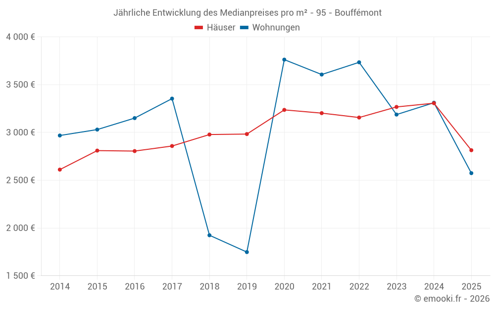 Der Durchschnittspreis auf den 18 Wohnungstransaktionen der letzten 24 Monate in der Gemeinde Bouffémont betrug 3 190 € pro Quadratmeter für einen mittleren Immobilienwert von 186 500 €. Über diesen Zeitraum hinweg lagen 60% der Transaktionen zwischen 2 265 und 3 781 € pro Quadratmeter (vom 2. bis zum 8. Dezil).