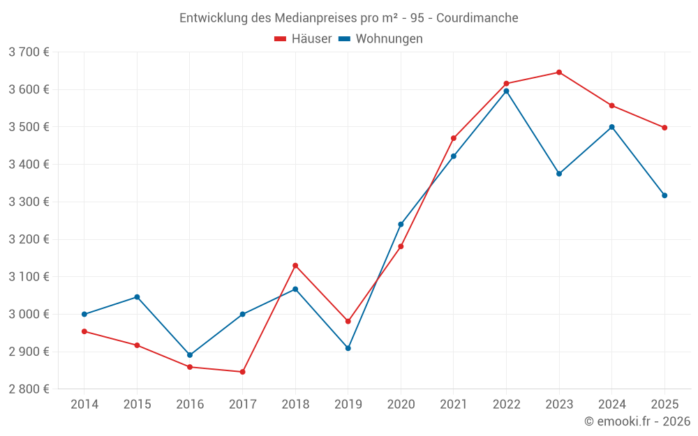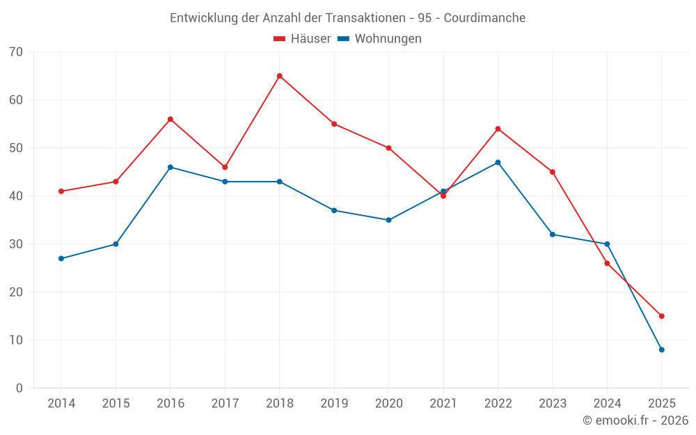 Der Durchschnittspreis auf den 26 Wohnungstransaktionen der letzten 12 Monate in der Gemeinde Courdimanche betrug 3 318 € pro Quadratmeter für einen mittleren Immobilienwert von 156 000 €. Über diesen Zeitraum hinweg lagen 60% der Transaktionen zwischen 3 000 und 3 615 € pro Quadratmeter (vom 2. bis zum 8. Dezil).