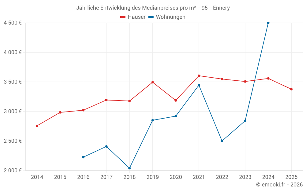 Der Durchschnittspreis auf den 23 Hausgeschäften der letzten 12 Monate in der Gemeinde Ennery betrug 3 440 € pro Quadratmeter für einen mittleren Immobilienwert von 377 500 €. Über diesen Zeitraum hinweg lagen 60% der Transaktionen zwischen 2 791 und 3 950 € pro Quadratmeter (vom 2. bis zum 8. Dezil).