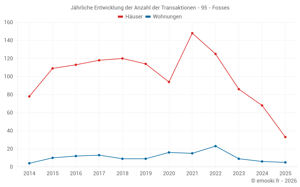 Der Durchschnittspreis auf den 33 Hausgeschäften der letzten 6 Monate in der Gemeinde Fosses betrug 2 654 € pro Quadratmeter für einen mittleren Immobilienwert von 233 000 €. Über diesen Zeitraum hinweg lagen 60% der Transaktionen zwischen 2 297 und 3 258 € pro Quadratmeter (vom 2. bis zum 8. Dezil).