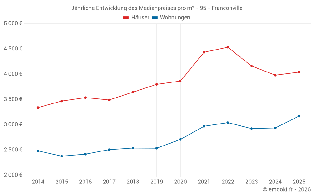 Der Durchschnittspreis auf den 35 Hausgeschäften der letzten 6 Monate in der Gemeinde Franconville betrug 4 036 € pro Quadratmeter für einen mittleren Immobilienwert von 345 000 €. Über diesen Zeitraum hinweg lagen 60% der Transaktionen zwischen 3 256 und 4 775 € pro Quadratmeter (vom 2. bis zum 8. Dezil).
