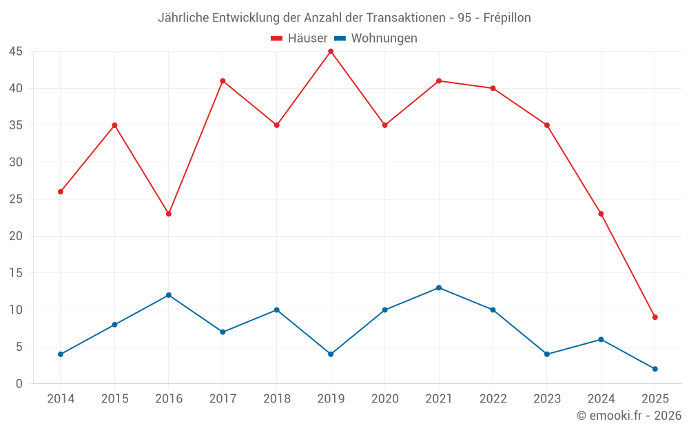 Der Durchschnittspreis auf den 23 Hausgeschäften der letzten 12 Monate in der Gemeinde Frépillon betrug 3 308 € pro Quadratmeter für einen mittleren Immobilienwert von 310 000 €. Über diesen Zeitraum hinweg lagen 60% der Transaktionen zwischen 2 807 und 3 966 € pro Quadratmeter (vom 2. bis zum 8. Dezil).