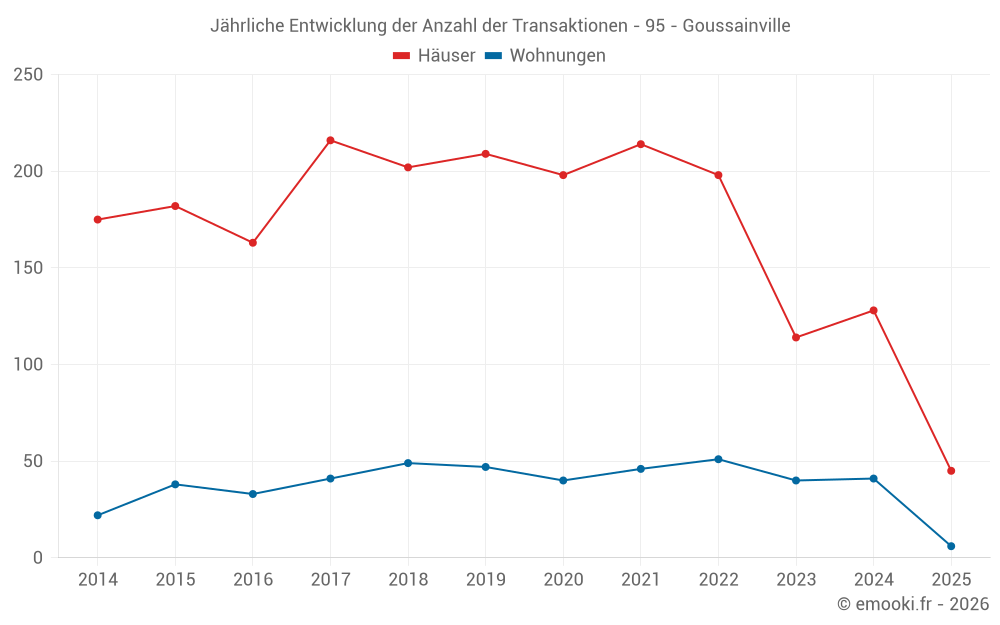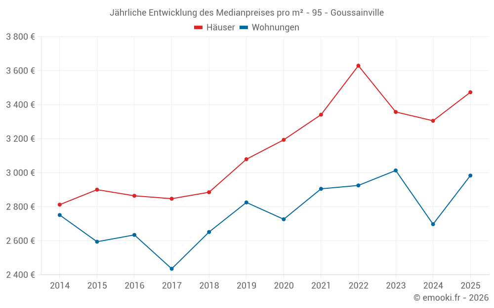 Der Durchschnittspreis auf den 20 Hausgeschäften der letzten 3 Monate in der Gemeinde Goussainville betrug 3 241 € pro Quadratmeter für einen mittleren Immobilienwert von 251 000 €. Über diesen Zeitraum hinweg lagen 60% der Transaktionen zwischen 2 755 und 4 063 € pro Quadratmeter (vom 2. bis zum 8. Dezil).