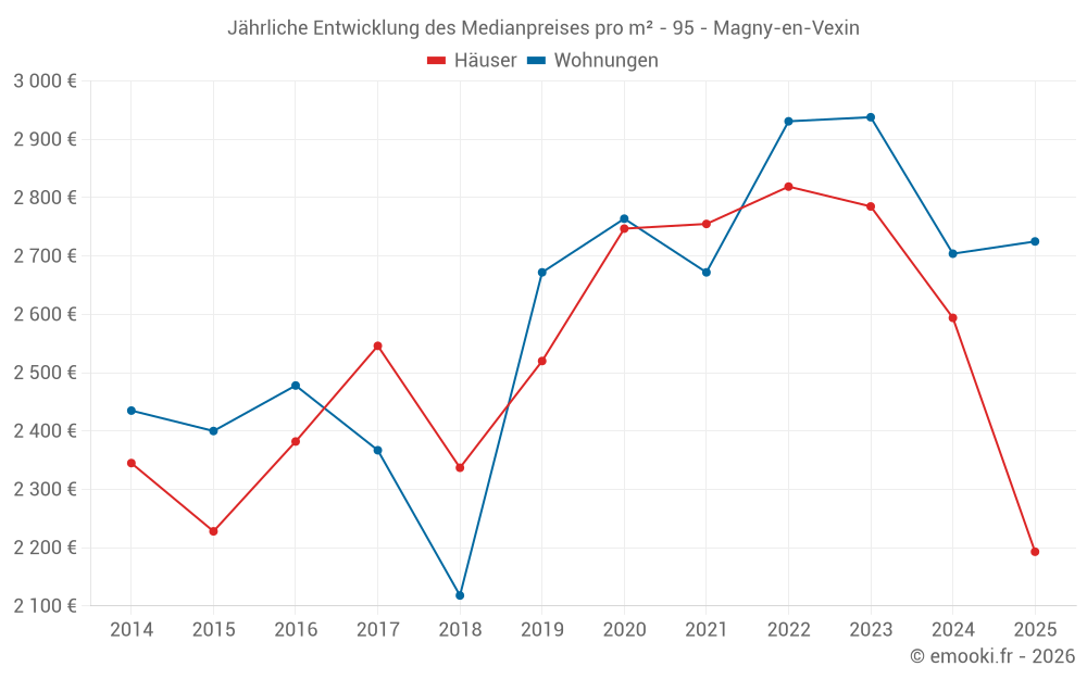 Der Durchschnittspreis auf den 31 Hausgeschäften der letzten 12 Monate in der Gemeinde Magny-en-Vexin betrug 2 193 € pro Quadratmeter für einen mittleren Immobilienwert von 260 000 €. Über diesen Zeitraum hinweg lagen 60% der Transaktionen zwischen 1 898 und 3 201 € pro Quadratmeter (vom 2. bis zum 8. Dezil).