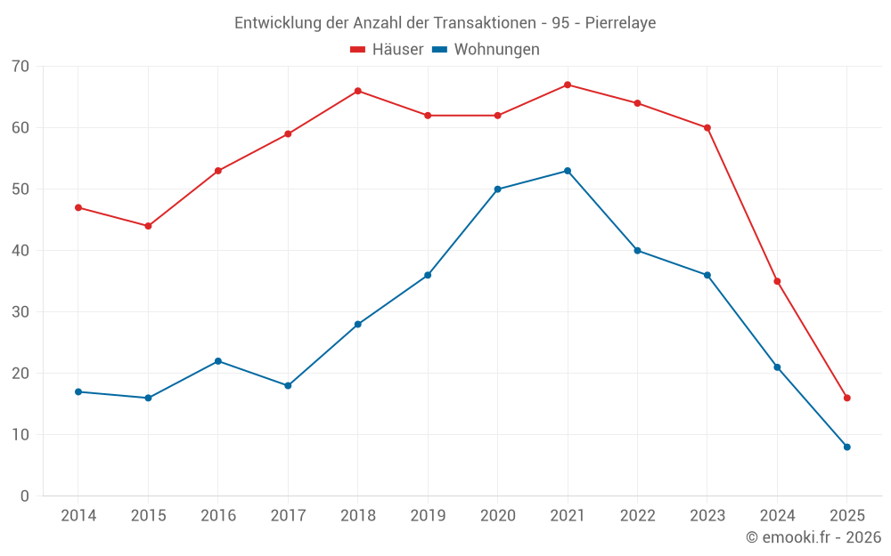 Der Durchschnittspreis auf den 39 Hausgeschäften der letzten 12 Monate in der Gemeinde Pierrelaye betrug 3 611 € pro Quadratmeter für einen mittleren Immobilienwert von 318 000 €. Über diesen Zeitraum hinweg lagen 60% der Transaktionen zwischen 2 846 und 4 480 € pro Quadratmeter (vom 2. bis zum 8. Dezil).