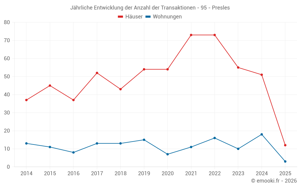Der Durchschnittspreis auf den 17 Wohnungstransaktionen der letzten 12 Monate in der Gemeinde Presles betrug 4 059 € pro Quadratmeter für einen mittleren Immobilienwert von 185 000 €. Über diesen Zeitraum hinweg lagen 60% der Transaktionen zwischen 2 949 und 4 865 € pro Quadratmeter (vom 2. bis zum 8. Dezil).