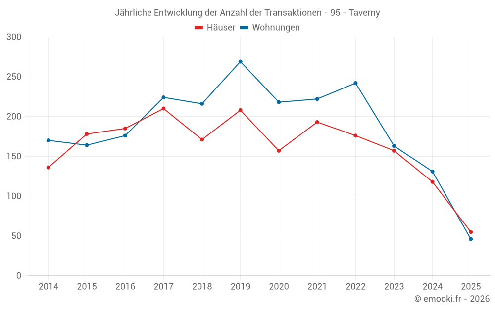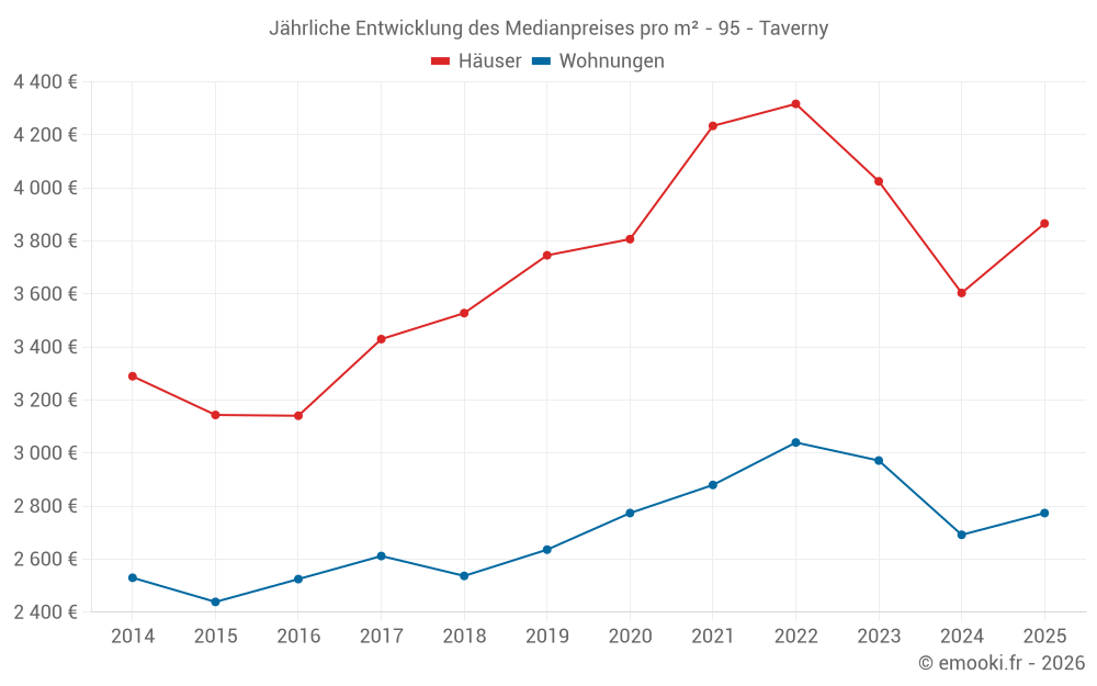 Der Durchschnittspreis auf den 46 Wohnungstransaktionen der letzten 6 Monate in der Gemeinde Taverny betrug 2 774 € pro Quadratmeter für einen mittleren Immobilienwert von 171 250 €. Über diesen Zeitraum hinweg lagen 60% der Transaktionen zwischen 2 388 und 3 286 € pro Quadratmeter (vom 2. bis zum 8. Dezil).