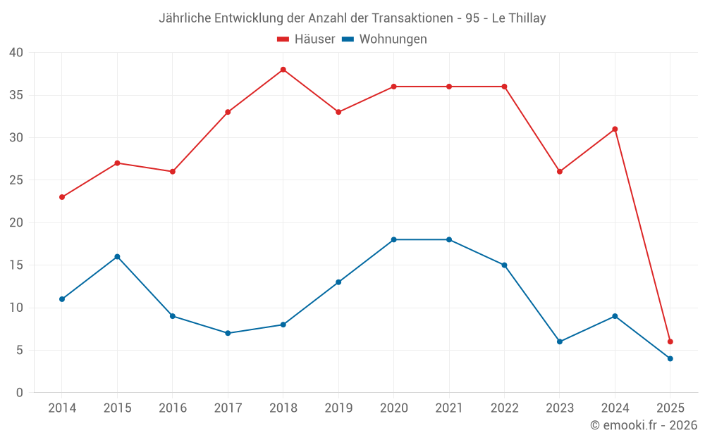 Der Durchschnittspreis auf den 25 Hausgeschäften der letzten 12 Monate in der Gemeinde Le Thillay betrug 3 462 € pro Quadratmeter für einen mittleren Immobilienwert von 280 000 €. Über diesen Zeitraum hinweg lagen 60% der Transaktionen zwischen 2 732 und 4 211 € pro Quadratmeter (vom 2. bis zum 8. Dezil).