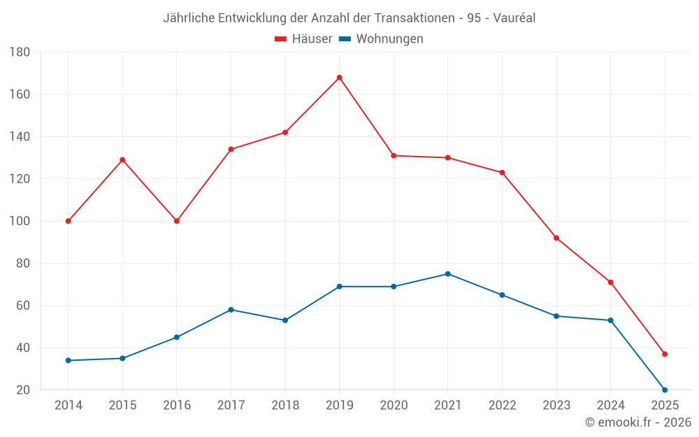 Der Durchschnittspreis auf den 20 Wohnungstransaktionen der letzten 6 Monate in der Gemeinde Vauréal betrug 3 718 € pro Quadratmeter für einen mittleren Immobilienwert von 214 855 €. Über diesen Zeitraum hinweg lagen 60% der Transaktionen zwischen 3 604 und 4 059 € pro Quadratmeter (vom 2. bis zum 8. Dezil).