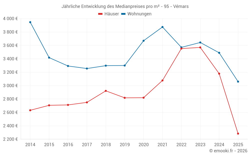 Der Durchschnittspreis auf den 24 Wohnungstransaktionen der letzten 24 Monate in der Gemeinde Vémars betrug 3 490 € pro Quadratmeter für einen mittleren Immobilienwert von 177 000 €. Über diesen Zeitraum hinweg lagen 60% der Transaktionen zwischen 3 202 und 3 990 € pro Quadratmeter (vom 2. bis zum 8. Dezil).