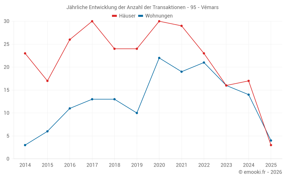 Der Durchschnittspreis auf den 27 Hausgeschäften der letzten 24 Monate in der Gemeinde Vémars betrug 3 125 € pro Quadratmeter für einen mittleren Immobilienwert von 267 000 €. Über diesen Zeitraum hinweg lagen 60% der Transaktionen zwischen 2 248 und 3 991 € pro Quadratmeter (vom 2. bis zum 8. Dezil).