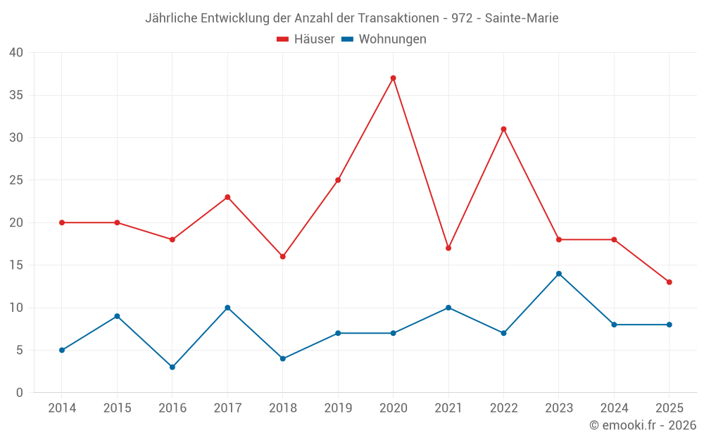 Der Durchschnittspreis auf den 31 Hausgeschäften der letzten 24 Monate in der Gemeinde Sainte-Marie betrug 2 137 € pro Quadratmeter für einen mittleren Immobilienwert von 180 058 €. Über diesen Zeitraum hinweg lagen 60% der Transaktionen zwischen 900 und 3 210 € pro Quadratmeter (vom 2. bis zum 8. Dezil).