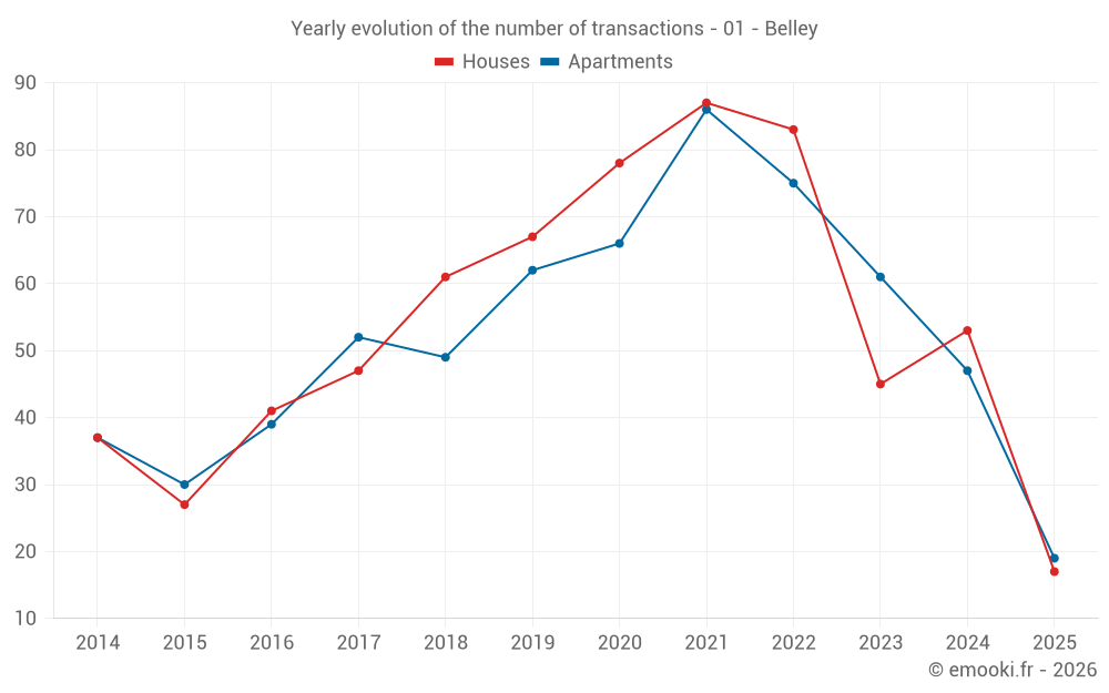 The median price on the 43 house transactions of the last 12 months in the municipality of Belley was 2 321 € per square meter for a median property value of 220 000 €. Over this period, 60% of transactions were between 1 403 and 2 548 € per square meter (from the 2nd to the 8th deciles).