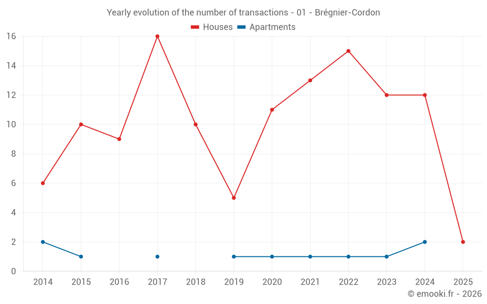 The median price on the 20 house transactions of the last 24 months in the municipality of Brégnier-Cordon was 1 950 € per square meter for a median property value of 170 500 €. Over this period, 60% of transactions were between 1 538 and 2 556 € per square meter (from the 2nd to the 8th deciles).