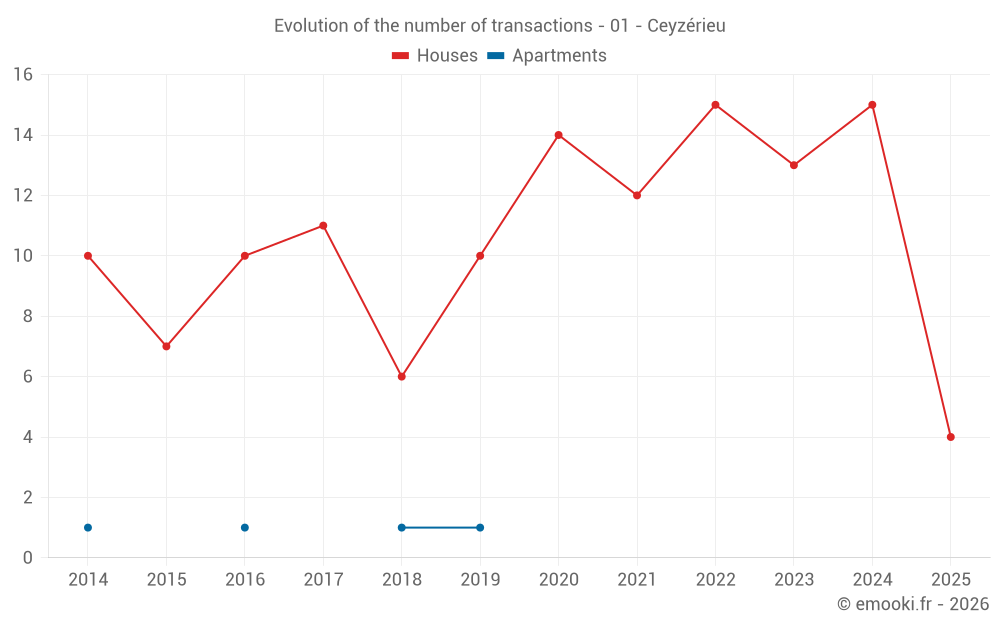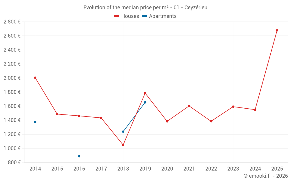 The median price on the 24 house transactions of the last 24 months in the municipality of Ceyzérieu was 2 166 € per square meter for a median property value of 177 500 €. Over this period, 60% of transactions were between 1 454 and 3 006 € per square meter (from the 2nd to the 8th deciles).