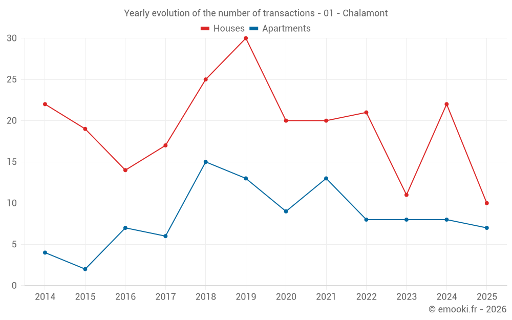 The median price on the 20 apartment transactions of the last 24 months in the municipality of Chalamont was 1 815 € per square meter for a median property value of 130 000 €. Over this period, 60% of transactions were between 1 674 and 2 302 € per square meter (from the 2nd to the 8th deciles).