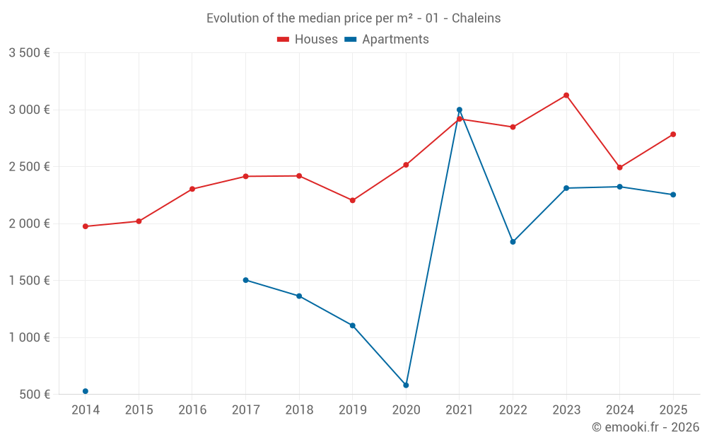 The median price on the 20 house transactions of the last 24 months in the municipality of Chaleins was 2 784 € per square meter for a median property value of 291 500 €. Over this period, 60% of transactions were between 1 913 and 3 319 € per square meter (from the 2nd to the 8th deciles).